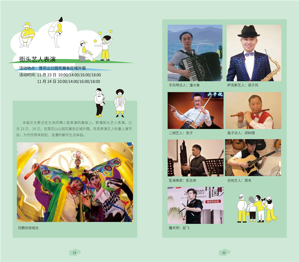 引人關(guān)注的是,本屆公園文化季首次引進(jìn)街頭藝人表演,11月23日、24日,在蓮花山公園花展現(xiàn)場,吉他、薩克斯、笛子、笙、揚琴、中阮、二胡、雜技、魔術(shù)等各類表演藝人輪番上演節(jié)目,為市民帶來輕松、浪漫的都市生活體驗。