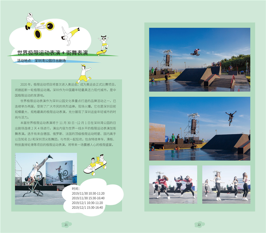 相比往年,今年既有年輕人熱衷的草地音樂會、街舞表演,針對青少年的網(wǎng)球、足球公開賽,又有兒童愛看的童話音樂劇,還有老年人喜愛的戲曲專場等等,活動節(jié)目覆蓋各個年齡段。例如,今年的深圳灣草地音樂會由中央民族樂團、廣州交響樂團、深圳交響樂團坐鎮(zhèn)表演,既突出民族特色,又有粵港澳和國際元素;世界極限運動由來自多國的頂級運動明星帶來表演。此外,還有多項首次開展的活動,例如,首屆自然教育嘉年華、新增街頭藝人表演等,契合深圳創(chuàng)意之都的特點,彰顯深圳的包容與多元。