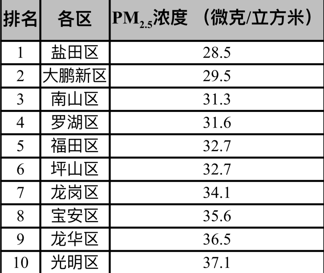 此外,各區(qū)PM2.5平均濃度在28.5-37.1微克/立方米之間,濃度較低的有鹽田、大鵬、南山,濃度較高的有光明、龍華和寶安。