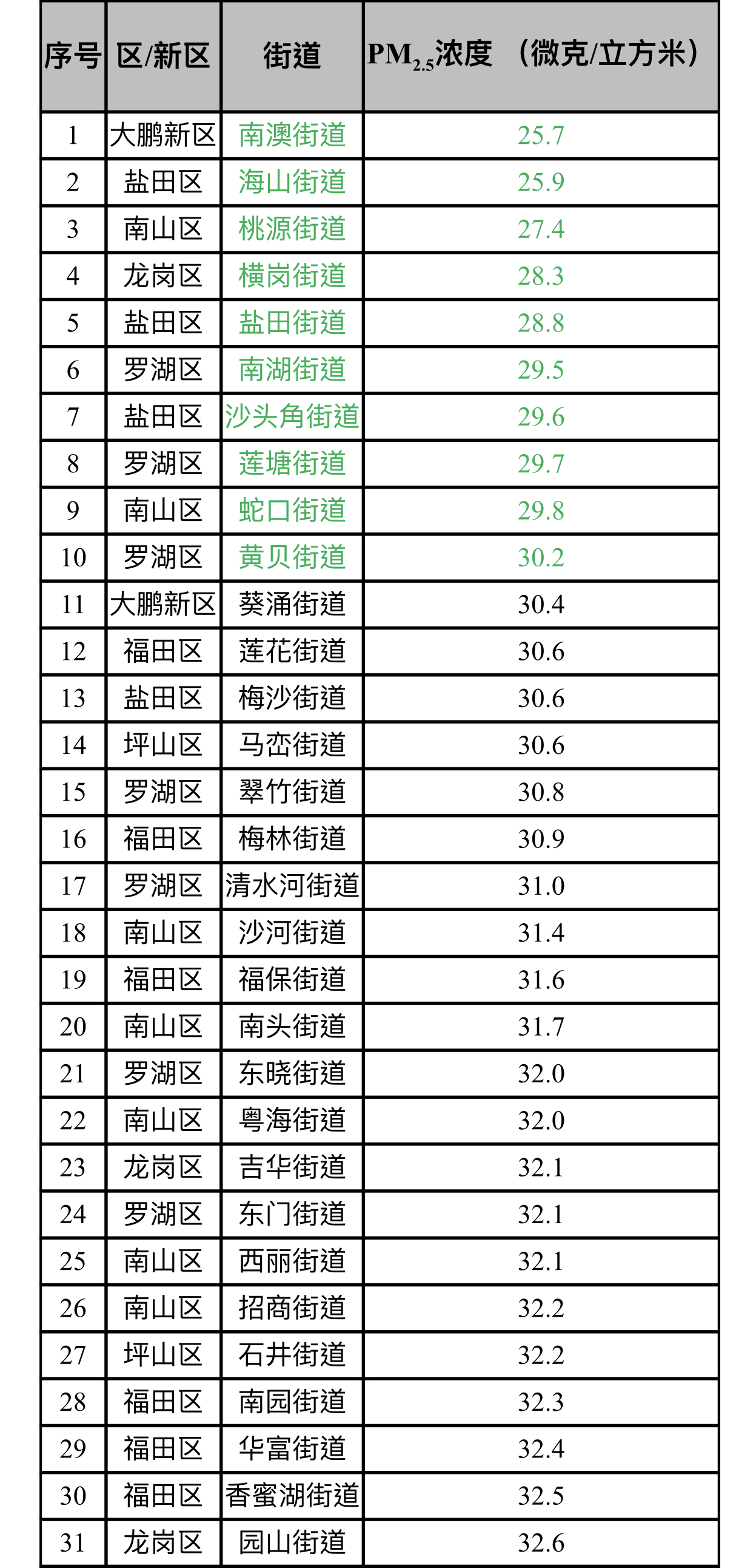 見圳客戶端·深圳新聞網2019年11月5日訊(見圳客戶端、深圳新聞網記者陳婕)11月5日,記者從深圳市生態(tài)環(huán)境局了解到,2019年10月,全市74個街道PM2.5濃度在25.7-40.4微克/立方米之間,均值為33.3微克/立方米。排名前十的是:南澳、海山、桃源、橫崗、鹽田、南湖、沙頭角、蓮塘、蛇口和黃貝等街道,排名倒數前十的是:新湖、觀瀾、平湖、新安、坪地、公明、福永、大浪、龍城和馬田等街道。