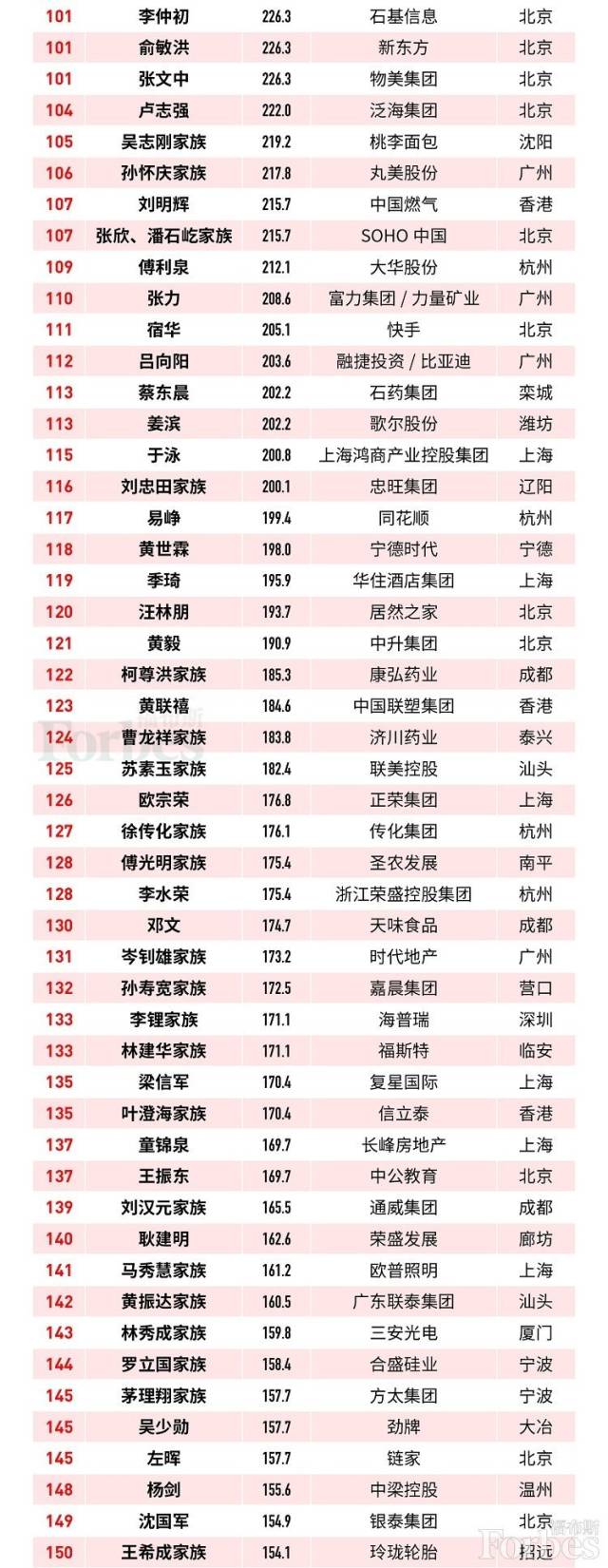 編制本榜單使用的持股和財(cái)務(wù)信息取自家族和個(gè)人、證交所、分析師和監(jiān)管機(jī)構(gòu)。資產(chǎn)計(jì)算使用的是截至10月25日的股價(jià)和匯率。非上市公司的估值基于對(duì)同類上市公司的分析評(píng)估。被抵押股權(quán)予以折價(jià)計(jì)算。與福布斯全球億萬(wàn)富豪榜不同,福布斯中國(guó)富豪榜包括參與配偶生意的夫婦。一些估算還包括其他家族成員擁有的資產(chǎn)。