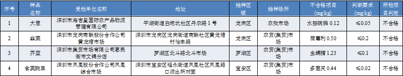 見(jiàn)圳客戶端·深圳新聞網(wǎng)2019年11月12日訊 11月11日,深圳市市場(chǎng)監(jiān)督管理局發(fā)布9月16日-9月20日深圳市農(nóng)產(chǎn)品質(zhì)量安全豬肉和蔬菜例行監(jiān)測(cè)結(jié)果。2019年9月16日-9月20日,深圳市市場(chǎng)監(jiān)督管理局在全市監(jiān)測(cè)豬肉產(chǎn)品53份,抽檢結(jié)果顯示全部樣品合格。抽檢蔬菜共124份,4份抽樣樣品不合格,都為農(nóng)藥檢測(cè)超標(biāo)。其中,深圳市海吉星國(guó)際農(nóng)產(chǎn)品物流管理有限公司銷售的大蔥水胺硫磷超標(biāo),深圳市龍崗南聯(lián)股份合作公司黃龍?zhí)潦袌?chǎng)銷售的韭菜腐霉利超標(biāo),深圳市集貿(mào)市場(chǎng)有限公司惠民街市文錦分店銷售的芥藍(lán)蟲(chóng)螨腈超標(biāo),深圳市鳳凰股份合作公司鳳凰綜合市場(chǎng)銷售的食莢豌豆多菌靈超標(biāo)。