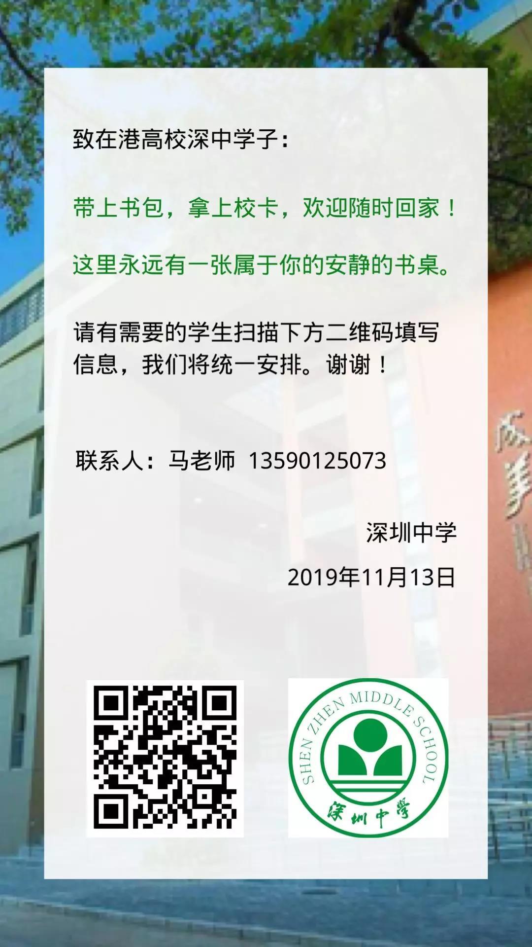 見圳客戶端·深圳新聞網(wǎng)2019年11月14日訊 繼香港中文大學(xué)(深圳)發(fā)文表示為內(nèi)地在港就讀學(xué)生提供臨時免費(fèi)住宿后,深圳中學(xué)今天也在官方微信公號中致信在港高校深中學(xué)子,只要拿上校園卡,深中隨時歡迎學(xué)子們回家!學(xué)校將對有需要的學(xué)生統(tǒng)一進(jìn)行安排。