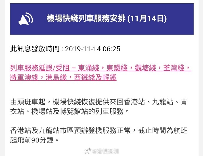 據(jù)港鐵官網(wǎng)目前最新消息,11月14日,港鐵各線(機(jī)場快線除外)、輕鐵及港鐵巴士的服務(wù)將于晚上10時結(jié)束,東涌線、東鐵線、觀塘線、荃灣線、將軍澳線、港島線、西鐵線及輕鐵列車服務(wù)延誤/受阻。