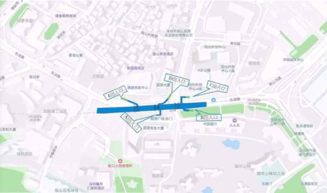 荔林站位于東濱路與南新路交叉口上,車(chē)站出入口共計(jì)5個(gè),A出入口位于荔園商務(wù)大廈北側(cè),B出入口位于城市山林廣場(chǎng)北側(cè),C出入口位于陽(yáng)光科創(chuàng)東南側(cè),D出入口位于荔源大廈東側(cè),E出入口位于濠盛商務(wù)中心南側(cè)