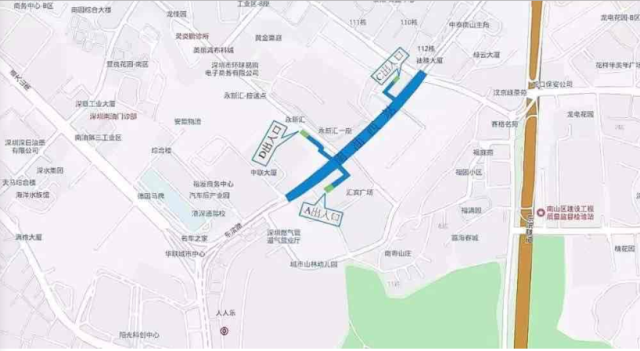 南油西站位于東濱路與南光路交叉口上,車站出入口共計(jì)3個(gè),A出入口位于匯賓廣場(chǎng)東側(cè),C出入口位于永新時(shí)代廣場(chǎng)的西側(cè),D出入口位于南光路與東濱路交匯處北側(cè)