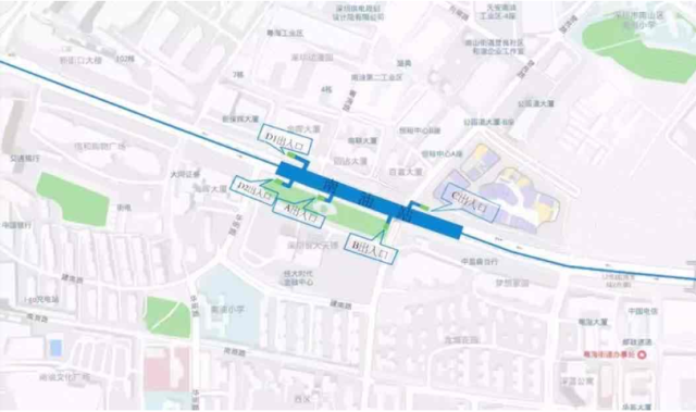 南油站位于南山區(qū)南海大道與登良路交叉口下方,車站出入口共計(jì)5個(gè),B出入口位于恒大天璟北側(cè),C出入口位于來(lái)福士廣場(chǎng)一側(cè)登良路與南海大道交匯處,D1出入口位于金暉大廈東側(cè),A、D2出入口位于南海大道與華明路交匯處