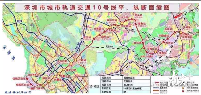 地鐵10號線,南連與香港毗鄰的福田口岸站,北接龍崗區(qū)雙擁街,線路全長約29公里,共設(shè)車站24座。