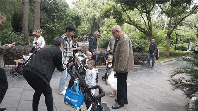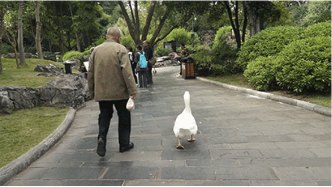 這一人一鵝的“夕陽(yáng)紅”組合,
