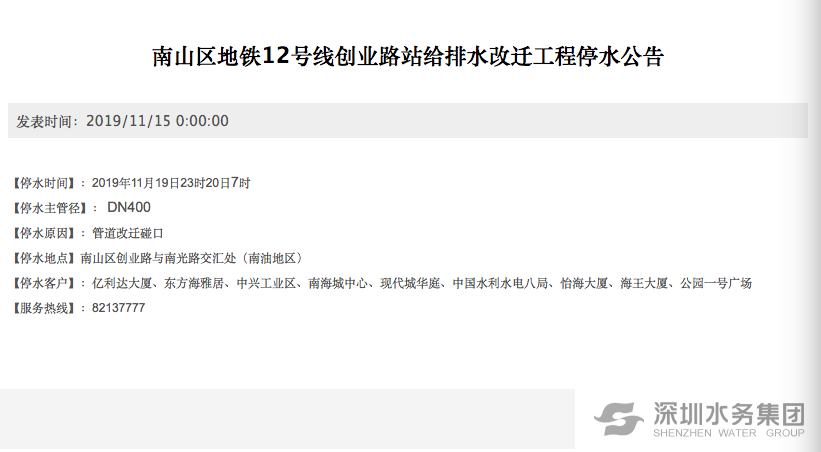 為配合南山區(qū)地鐵12號線創(chuàng)業(yè)路站給排水改遷工程,深圳水務集團計劃于11月19日23時20日7時,對南山區(qū)創(chuàng)業(yè)路與南光路交匯處DN400供水管道進行改遷碰口,屆時南油地區(qū)暫停供水。具體影響用戶為:億利達大廈、東方海雅居、中興工業(yè)區(qū)、南海城中心、現代城華庭、中國水利水電八局、怡海大廈、海王大廈、公園一號廣場。