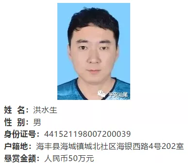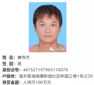 汕尾市公安局于11月11日發(fā)布的通告中,共有3人被懸賞通緝,分別是鄭海田(金額100萬)、唐偉杰(金額100萬)、洪水生(金額50萬)。