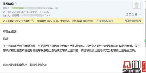 海航方面回復(fù)葉先生郵件截圖(圖片由葉先生提供)