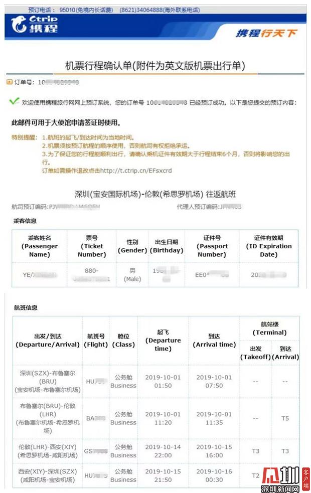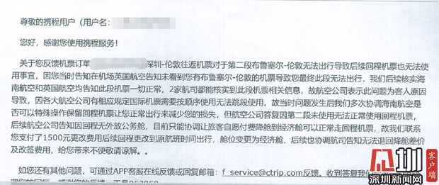 近日,葉先生向深圳新聞網(wǎng)記者爆料稱,他于今年8月份通過攜程網(wǎng)購買國慶期間深圳往返倫敦的機(jī)票,但轉(zhuǎn)機(jī)時卻因查不到登機(jī)信息導(dǎo)致滯留機(jī)場,又因航司規(guī)定被剝奪返程機(jī)票的使用權(quán)。事后,葉先生反復(fù)與平臺及航司溝通要求說明事件原因并要求賠償,但目前事件尚未完全解決。