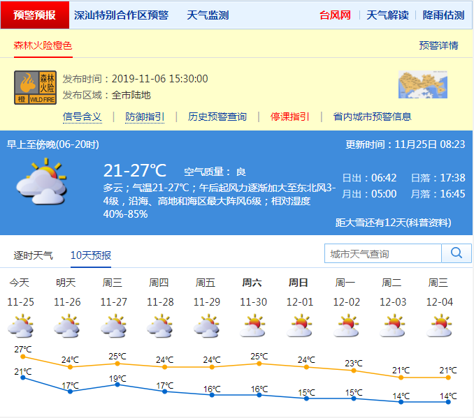 據(jù)悉,26日受冷空氣影響,氣溫下降,早晨最低氣溫降至16-17℃,沿海、高地和海區(qū)最大陣風6級左右;27日風力減弱,早晚清涼;28-30日冷空氣持續(xù)補充影響,空氣持續(xù)干燥,氣溫逐日下降。深圳市氣象臺2019-11-2508:23:00發(fā)布。
