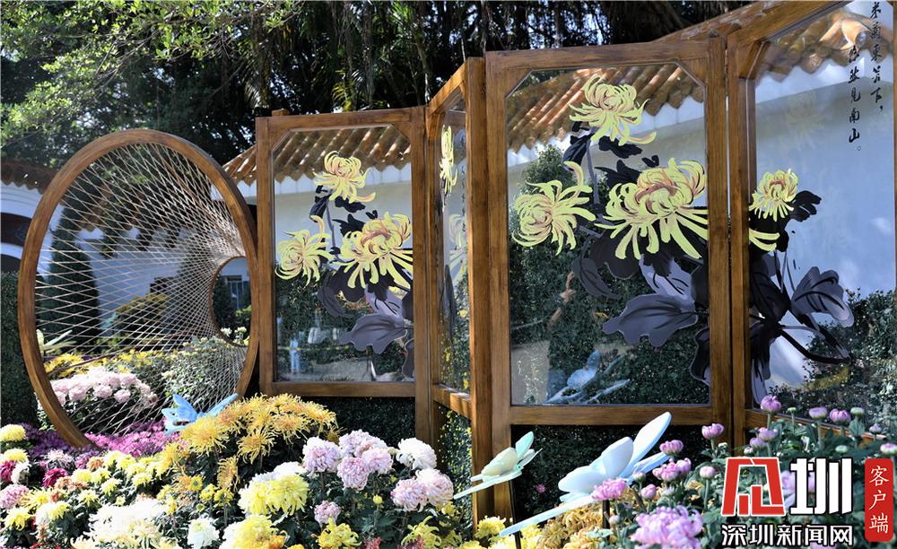 相較往年,今年的品種菊和盆景菊還增添了背景裝飾,結(jié)合展示菊花詩詞、山水圖案的竹簾畫和布畫裝飾,突顯菊花的文化魅力,豐富菊花展的文化內(nèi)涵。
