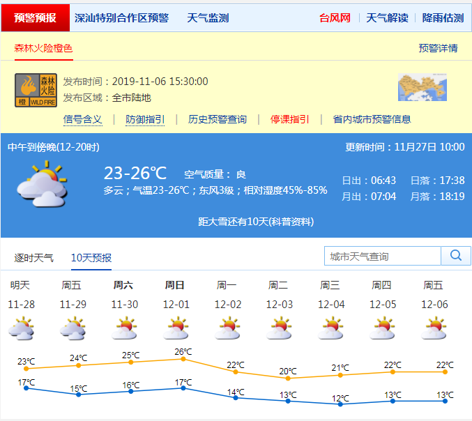 見圳客戶端·深圳新聞網2019年11月27日訊 記者從市氣象臺獲悉,27日夜間,新一股冷空氣將開始影響深圳,預計11月28-29日空氣持續(xù)干燥,早晚較涼,沿海、高地和海區(qū)陣風6-7級;30日-12月1日,氣溫略有回升。