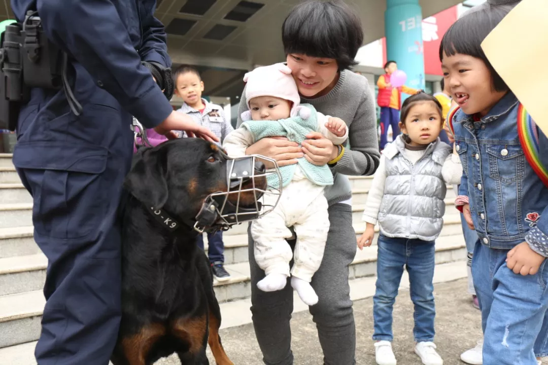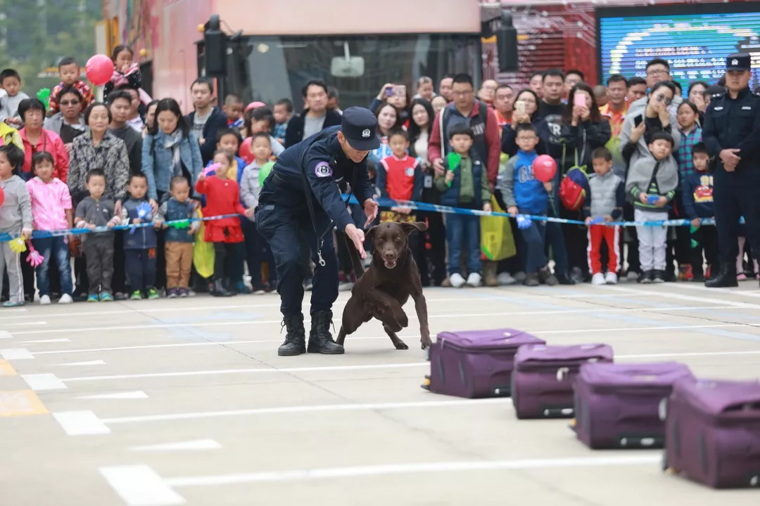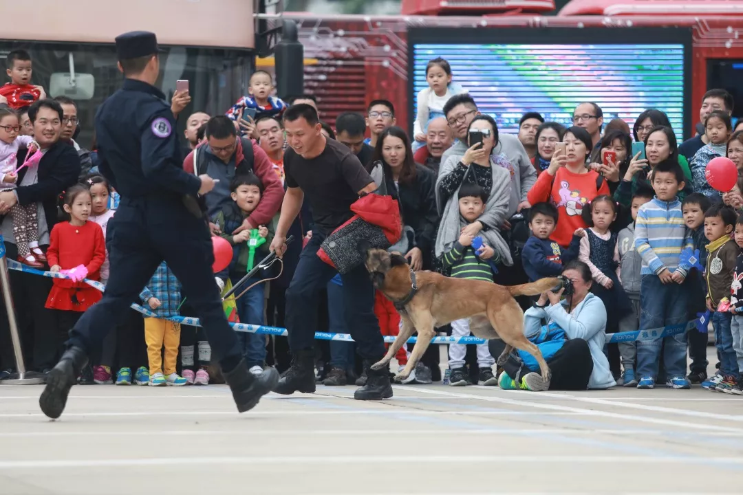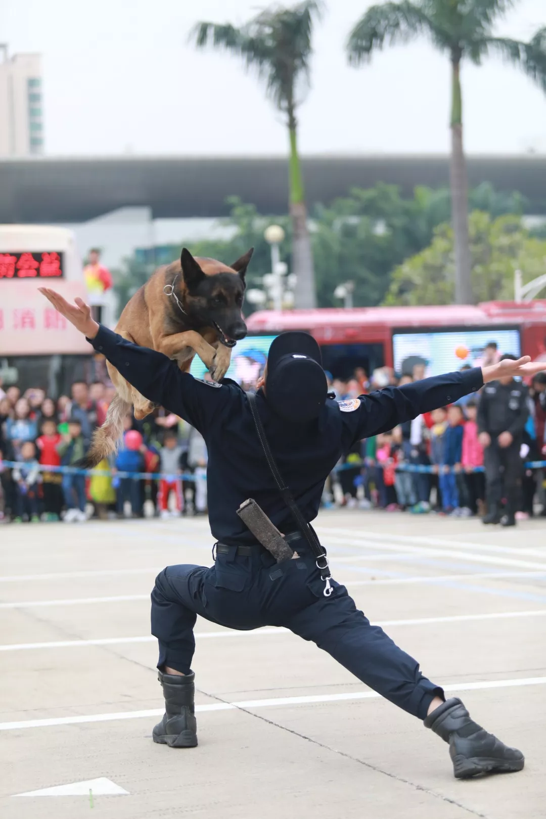 演出科目:跳躍人體障礙、實戰(zhàn)撲咬、箱包搜索、解救人質(zhì)、跳火圈等