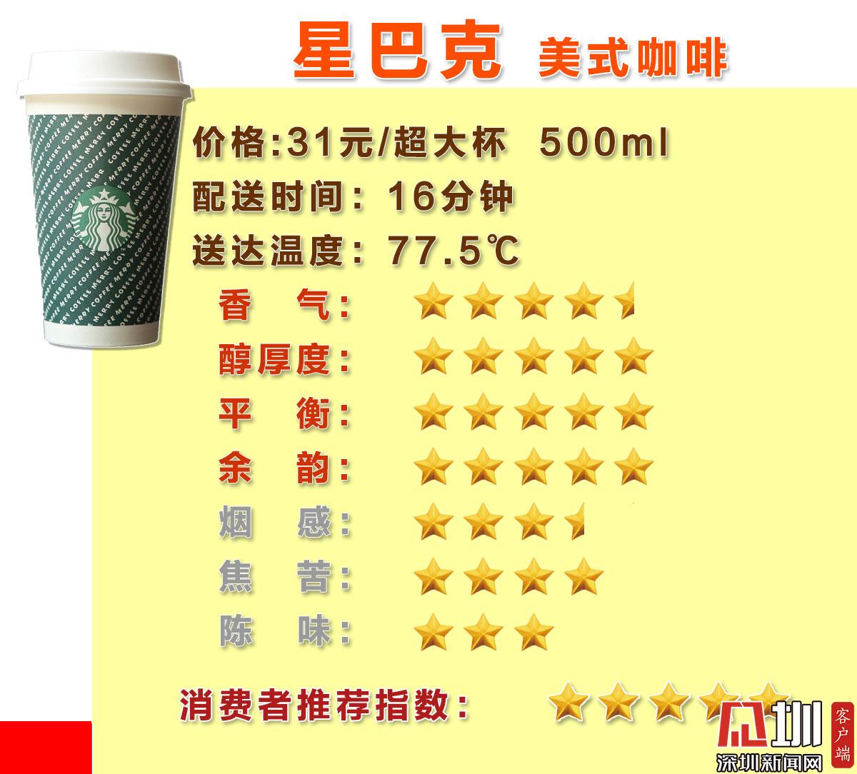 時(shí)間及溫度方面,因各品牌咖啡配送距離不一致,該兩項(xiàng)數(shù)據(jù)僅做參考使用。(配送時(shí)間段:13:30-15:30)在外賣(mài)到達(dá)時(shí)第一時(shí)間測(cè)量溫度并記錄配送時(shí)間,具體數(shù)據(jù)如下:星巴克咖啡配送時(shí)間為17分鐘,送達(dá)溫度為58.5℃;瑞幸用時(shí)29分鐘,送達(dá)溫度為54.4℃;Costa咖啡用時(shí)45分鐘送,達(dá)溫度為46.8℃;太平洋咖啡用時(shí)45分鐘,送達(dá)溫度為54.5℃。