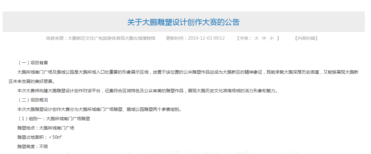見(jiàn)圳客戶端·深圳新聞網(wǎng)2019年12月3日訊 為了展現(xiàn)大鵬歷史文化濱海場(chǎng)域的活力形象和魅力,12月3日,大鵬新區(qū)文化廣電旅游體育局大鵬古城博物館啟動(dòng)大鵬雕塑設(shè)計(jì)創(chuàng)作大賽,征集大鵬所城南門(mén)廣場(chǎng)及鵬城公園雕塑作品,參賽不限單位或個(gè)人,最終每組作品都將評(píng)選出6名獲獎(jiǎng)?wù)撸瑔雾?xiàng)最高獲4萬(wàn)元獎(jiǎng)金,總獎(jiǎng)金22萬(wàn)元。