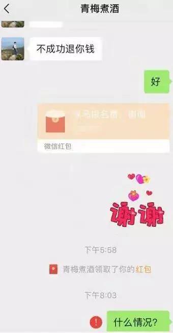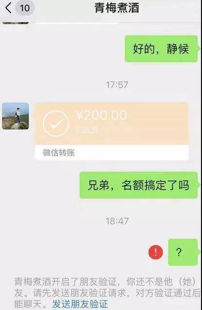 從文章中的聊天截圖可見,有跑友向其詢問如何報名深圳國際馬拉松。“青梅煮酒”回復發(fā)個人資料和200元報名費,他會“發(fā)給組委會那邊報名?!比欢谄涫杖″X款后,迅速將跑友拉黑了。