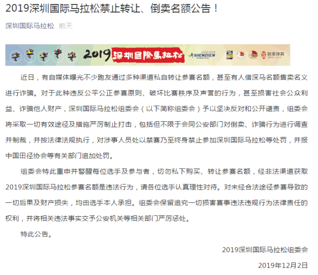 組委會表示,將采取一切有效途徑及措施嚴(yán)厲制止打擊,包括但不限于會同公安部門對倒賣、詐騙行為進(jìn)行調(diào)查并制裁,并按法律法規(guī)執(zhí)行,對涉事人員處以禁賽乃至終身禁止參加深圳國際馬拉松等處罰,并報中國田徑協(xié)會等有關(guān)部門追加處罰。