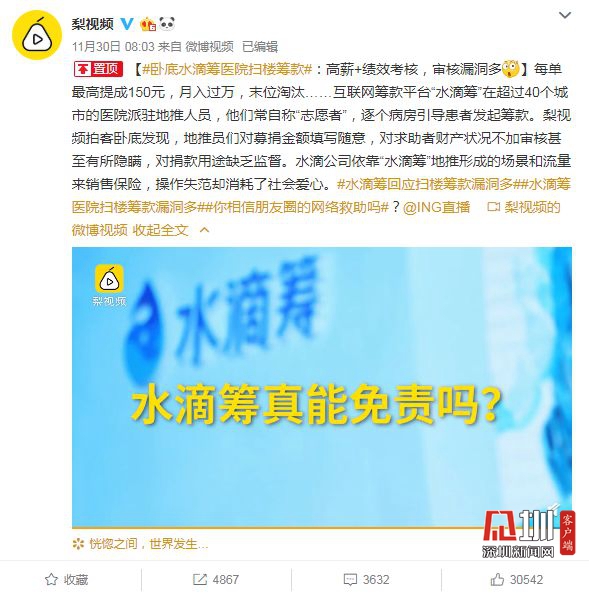 見圳客戶端.深圳新聞網(wǎng)2019年12月6日訊(見圳客戶端、深圳新聞網(wǎng)記者 張玲)2019年11月30日,據(jù)梨視頻報(bào)道,互聯(lián)網(wǎng)籌款平臺“水滴籌”在超過40個(gè)城市的醫(yī)院派駐地推人員,線下地推服務(wù)人員被指在醫(yī)院“掃樓”尋找求助者,套用模板,隨意填寫金額,不審核甚至隱瞞求助者財(cái)產(chǎn)狀況,鼓勵(lì)患者大量轉(zhuǎn)發(fā)籌款信息。同日,水滴籌通過微博官方認(rèn)證公眾號回應(yīng)稱,已第一時(shí)間成立緊急工作小組開展相關(guān)情況排查,同時(shí)線下服務(wù)團(tuán)隊(duì)全面暫停服務(wù),整頓徹查類似違規(guī)行為,并對梨視頻報(bào)道可能引發(fā)的誤解進(jìn)行了3點(diǎn)說明。