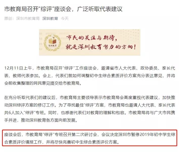 座談會(huì)后,市教育局“綜評(píng)”專班召開第二次研討會(huì),會(huì)議決定深圳市暫停2019年初中學(xué)生綜合素質(zhì)評(píng)價(jià)填報(bào)工作,并將盡快完善初中生綜合素質(zhì)評(píng)價(jià)方案。