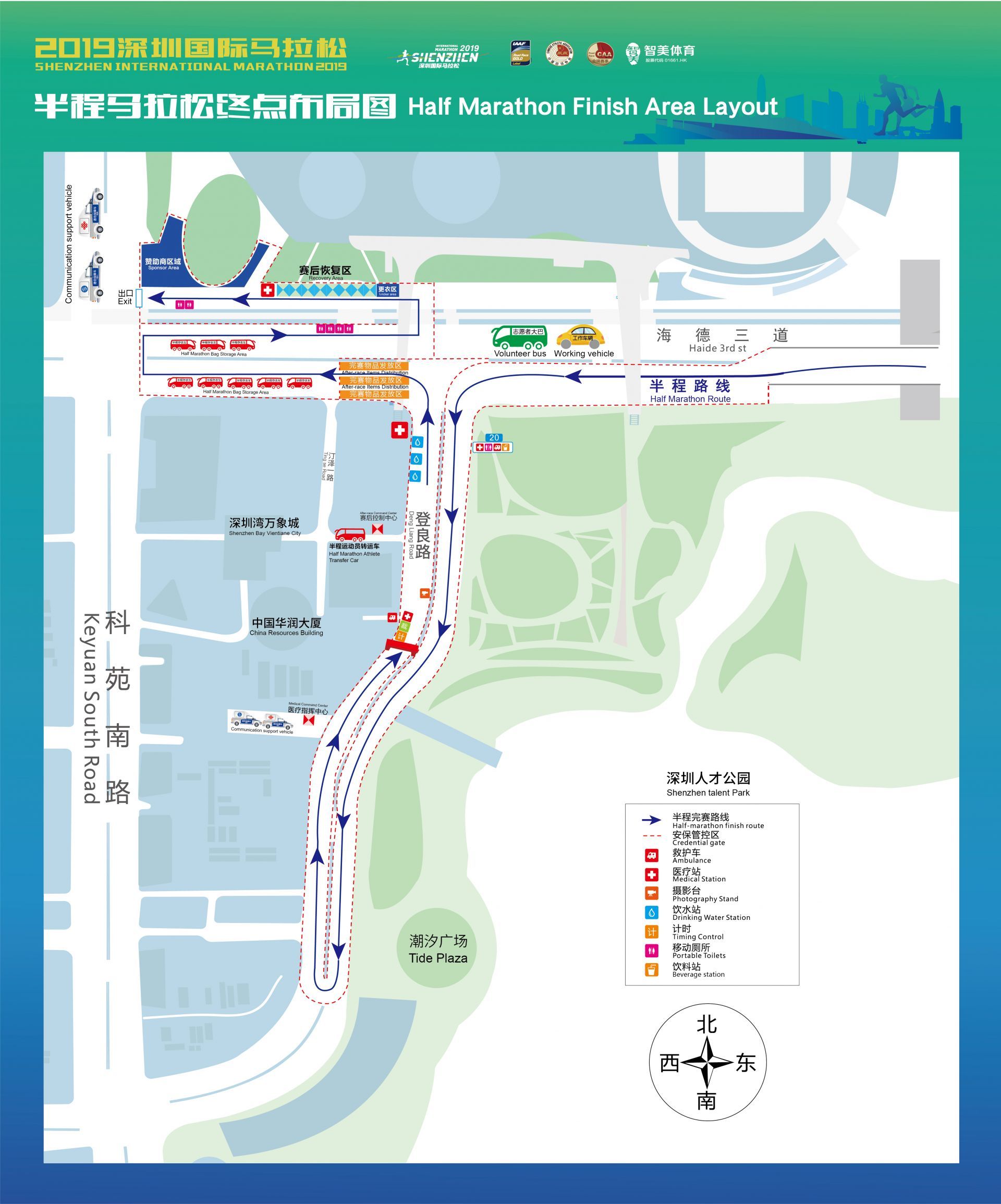 2.半程馬拉松路線為:深圳市民中心(起點)→深南大道(北側(cè)西行)→沙河西路(西側(cè)南行)→ 望海路(婚慶公園折返)→沙河西路(東側(cè)北行)→海德三道(南側(cè)西行)→登良路北往南(折返)→登良路南往北路段(半程終點)。