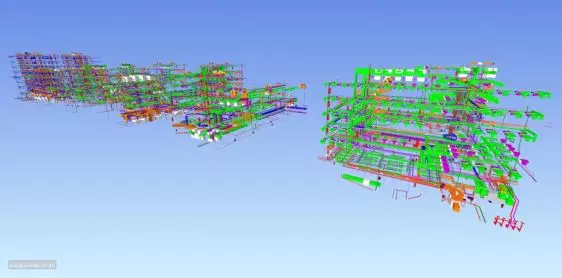 在施工準備階段,優(yōu)化原設(shè)計圖紙,提前解決施工階段遇到的問題,實現(xiàn)BIM深化圖指導(dǎo)現(xiàn)場施工放樣及管道安裝,滿足規(guī)范及空間使用要求;施工實施階段,基于BIM深化模型輸出工程量清單,輔助材料管理人員物資采購管理,支架深化及輸出加工圖,推進項目精細化管理。