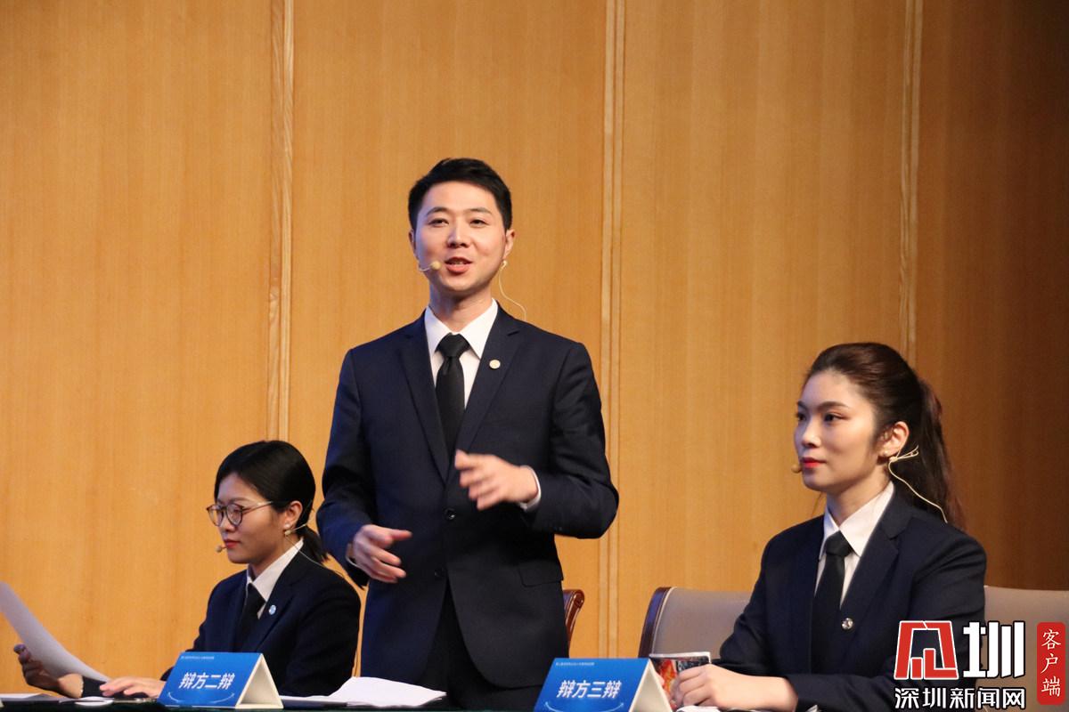 第一個辯題結(jié)束后,辯方辯手接受深圳新聞網(wǎng)記者采訪。從左到右依次為卜祥波、李銳杰、艾青三位律師。