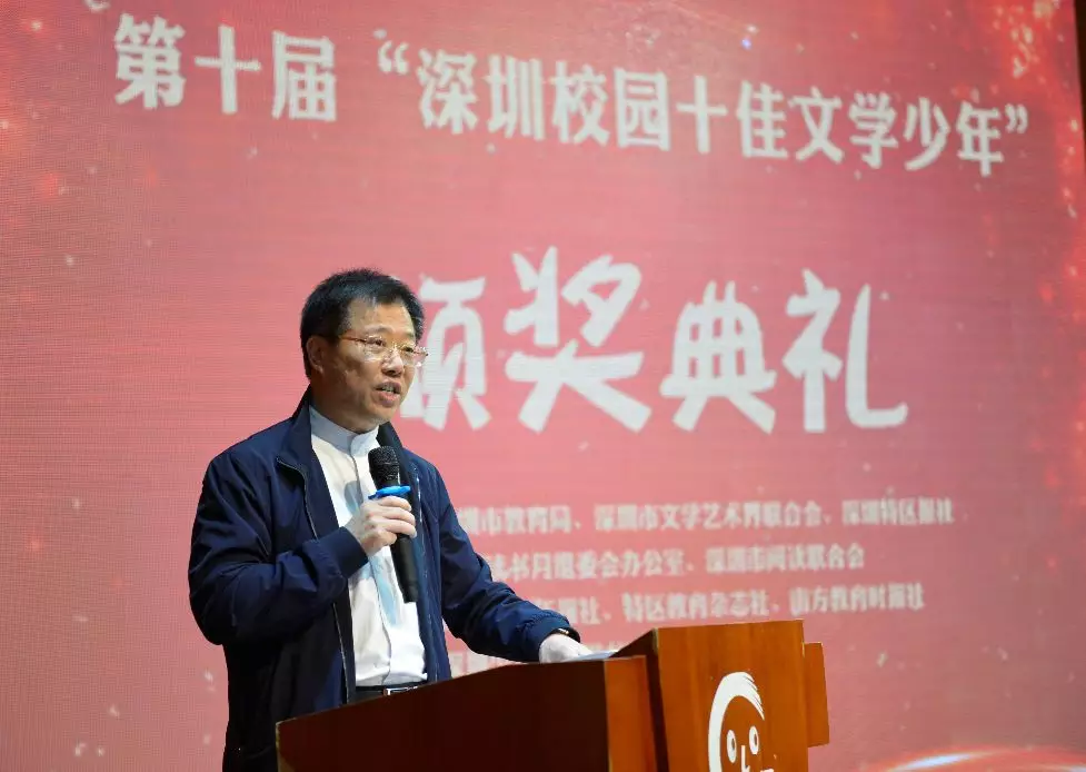 市教育局副局長王水發(fā)代表深圳市教育局向獲獎的同學(xué)表示熱烈祝賀。他說,為了培育社會核心價值、傳承民族文化基因、培養(yǎng)文化創(chuàng)意人才,深圳校園文學(xué)開辟了一條新的路徑,對深圳建設(shè)城市文明典范起到了奠基、培根和固本的重要作用。
