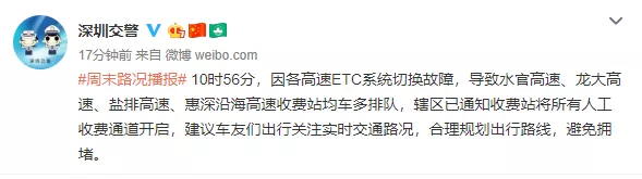 10時56分,因各高速ETC系統(tǒng)切換故障,導(dǎo)致水官高速、龍大高速、鹽排高速、惠深沿海高速收費站均車多排隊,轄區(qū)已通知收費站將所有人工收費通道開啟,建議車友們出行關(guān)注實時交通路況,合理規(guī)劃出行路線,避免擁堵。
