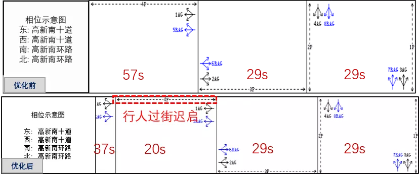拆分東進(jìn)口機(jī)動(dòng)車綠燈時(shí)間,行人晚啟,以減少東進(jìn)口右轉(zhuǎn)機(jī)動(dòng)車與北側(cè)行人交織。