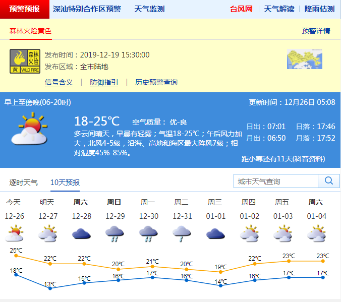 見(jiàn)圳客戶端·深圳新聞網(wǎng)2019年12月26日訊 今日白天多云,氣溫18-25℃,明天傍晚至27日受冷空氣影響,北風(fēng)加大,沿海、高地和海區(qū)最大陣風(fēng)7級(jí)左右,氣溫下降4-5℃,天氣轉(zhuǎn)涼。28日多云,29-30日有一次明顯降雨過(guò)程。