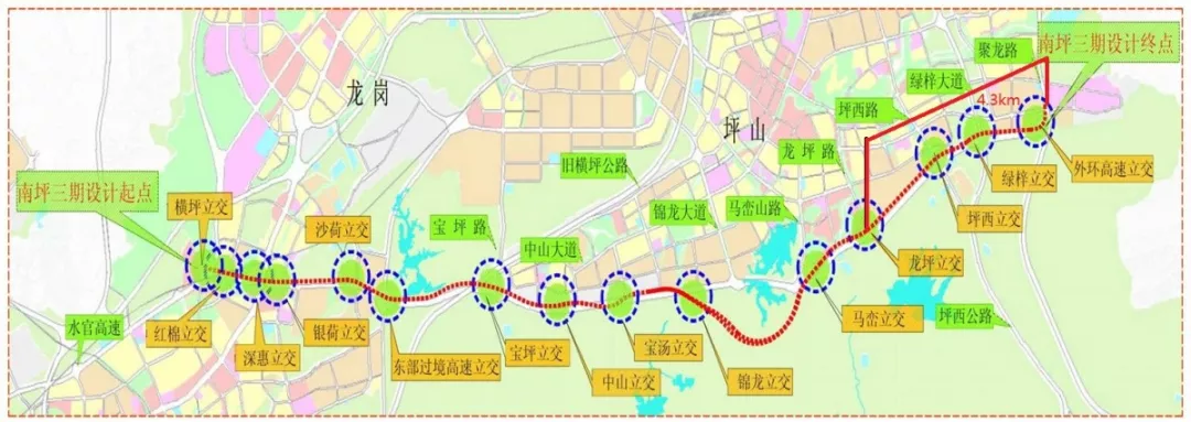 至于沿線立交方面,沿線龍崗大道立交、東部過(guò)境立交、中山立交、龍坪立交已開通。坪西立交計(jì)劃近期開通。