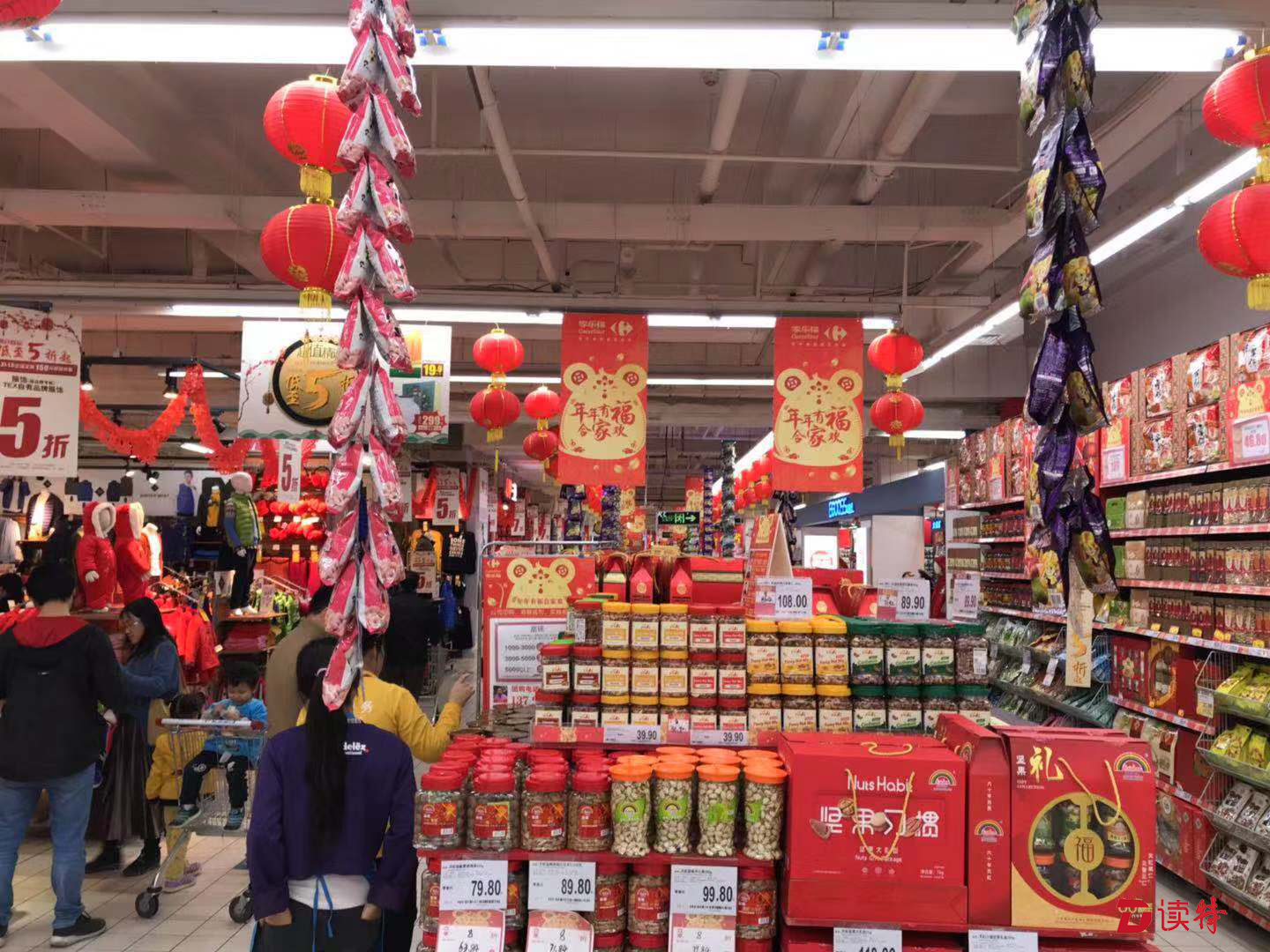 記者在華潤萬家、沃爾瑪、家樂福等商超門店看到,干果飲料、糖果餅干、酒水等各式各樣的年貨禮盒禮包被整齊擺放在顯眼位置,并標(biāo)貼著優(yōu)惠價簽;年貨街以及春聯(lián)、中國結(jié)、紅燈籠等春節(jié)飾品區(qū)等購物場景一一上線,干貨、腌制食品等熱門年貨也加入了促銷陣營;“恭喜發(fā)財”等新春標(biāo)配曲目已在某商超開始播放,讓人可以感受鼠年春節(jié)將至的氛圍。