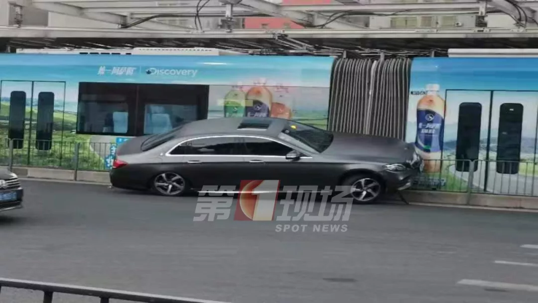 《第一現(xiàn)場》記者立即趕到事發(fā)地點,看到有軌電車旁邊的2扇護(hù)欄被小車撞掉了,事發(fā)現(xiàn)場用警戒線圍著。監(jiān)控畫面顯示,今天下午16點48分,一輛黑色奔馳轎車在行駛過程中,突然騎上道路左邊的路沿石,撞倒了護(hù)欄之后,再撞到有軌電車。