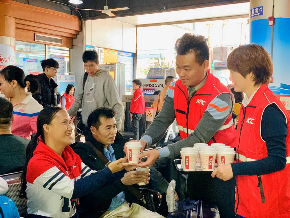 春節(jié)臨近,深圳福永汽車站迎來旅客返鄉(xiāng)的高峰。1月12日,深圳肯德基聯(lián)合福永義工聯(lián)為返鄉(xiāng)的建設(shè)者贈送1000杯愛心熱飲,將溫暖與愛帶回家。據(jù)悉,這是深圳肯德基第三年參與春運愛心贈飲活動。