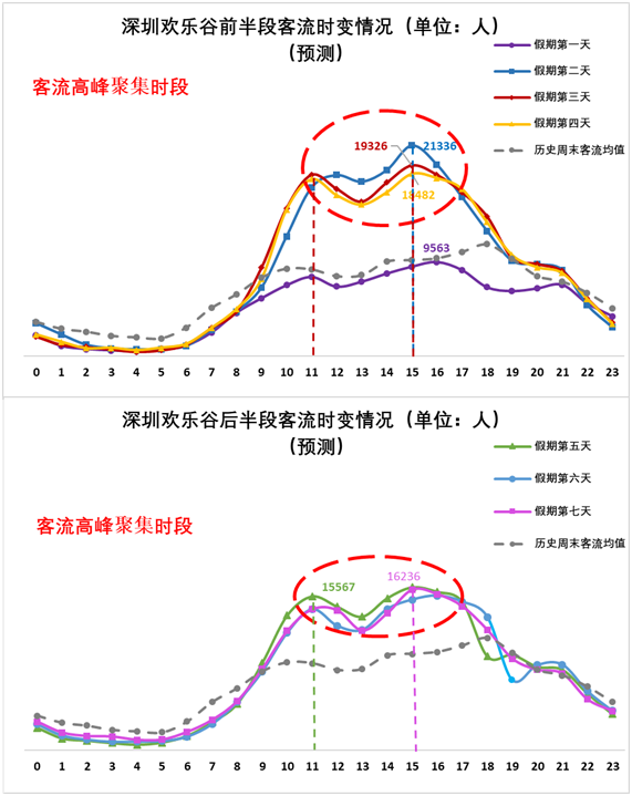 2、市內(nèi)熱門景區(qū)方面:預計1月25日至1月30日(正月初一至正月初六)深圳歡樂谷在11:00-12:00和15:00-16:00出現(xiàn)客流高峰、東部華僑城在10:00-11:00出現(xiàn)客流高峰;預計1月25日至1月27日(正月初一至正月初三),歡樂海岸在15:00前后出現(xiàn)客流高峰。
