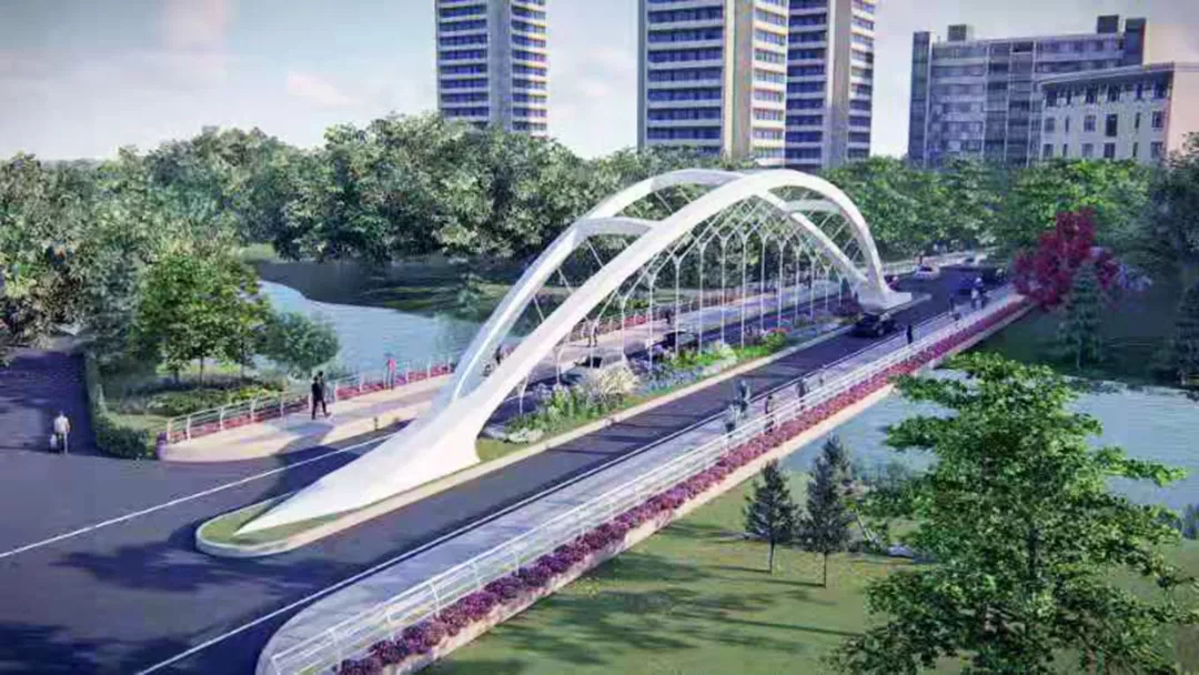 據(jù)介紹,凌菊路跨大沙河橋主體結(jié)構(gòu)需與大沙河生態(tài)長廊同步建設(shè),項目工期緊、任務(wù)重。根據(jù)相關(guān)規(guī)定,橋梁在河中不能設(shè)支墩,與大沙河河道需滿足2.5m的凈高要求,橋梁跨度大。最終,該項目采用下承式拱結(jié)構(gòu)鋼橋,鋼結(jié)構(gòu)橋梁可在工廠提前預制,運輸至現(xiàn)場安裝,解決了技術(shù)和工期緊等難題。