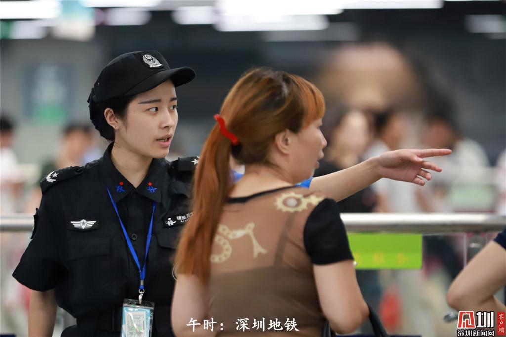 12點(diǎn)56分,深圳地鐵安檢人員謝幗英為乘客指路。