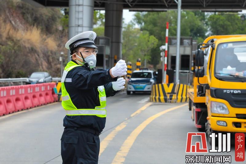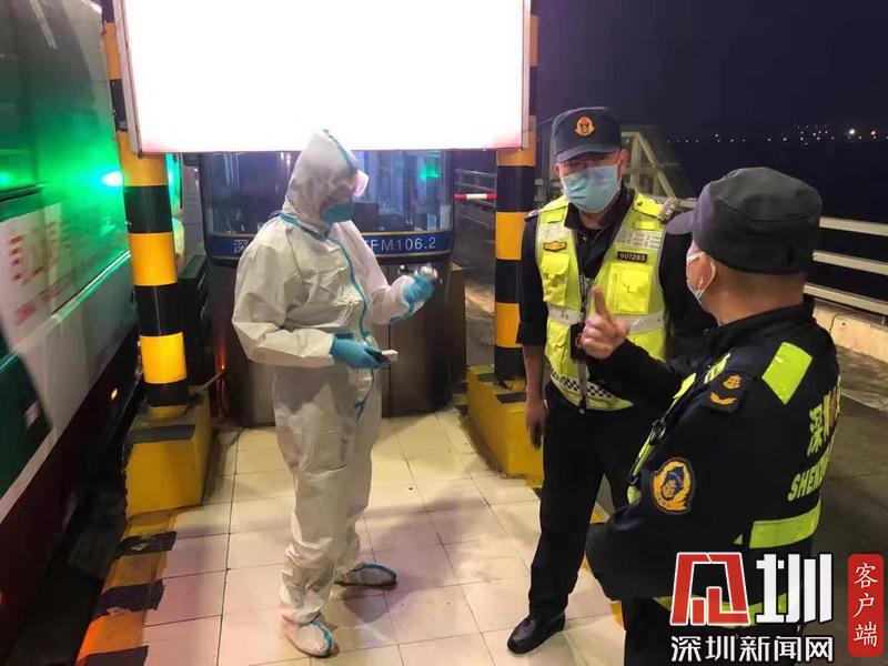 深高速公司工作人員在龍大高速免費段設(shè)點,對往來車輛車主進行體溫檢測。