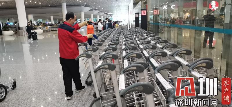 在深圳機場,工作人員對往來乘客進行體溫檢測。