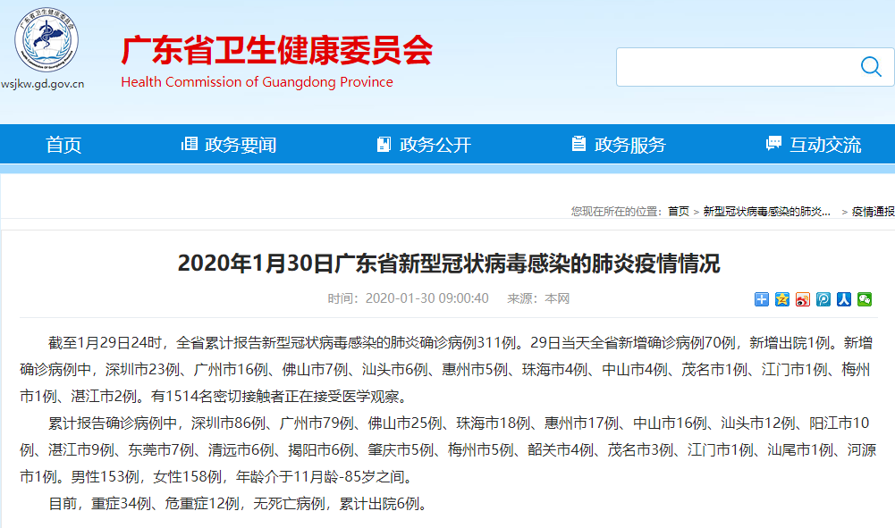 截至1月29日24時(shí),廣東省累計(jì)報(bào)告新型冠狀病毒感染的肺炎確診病例311例。29日當(dāng)天廣東全省新增確診病例70例,新增出院1例。新增確診病例中,深圳市23例、廣州市16例、佛山市7例、汕頭市6例、惠州市5例、珠海市4例、中山市4例、茂名市1例、江門市1例、梅州市1例、湛江市2例。有1514名密切接觸者正在接受醫(yī)學(xué)觀察。