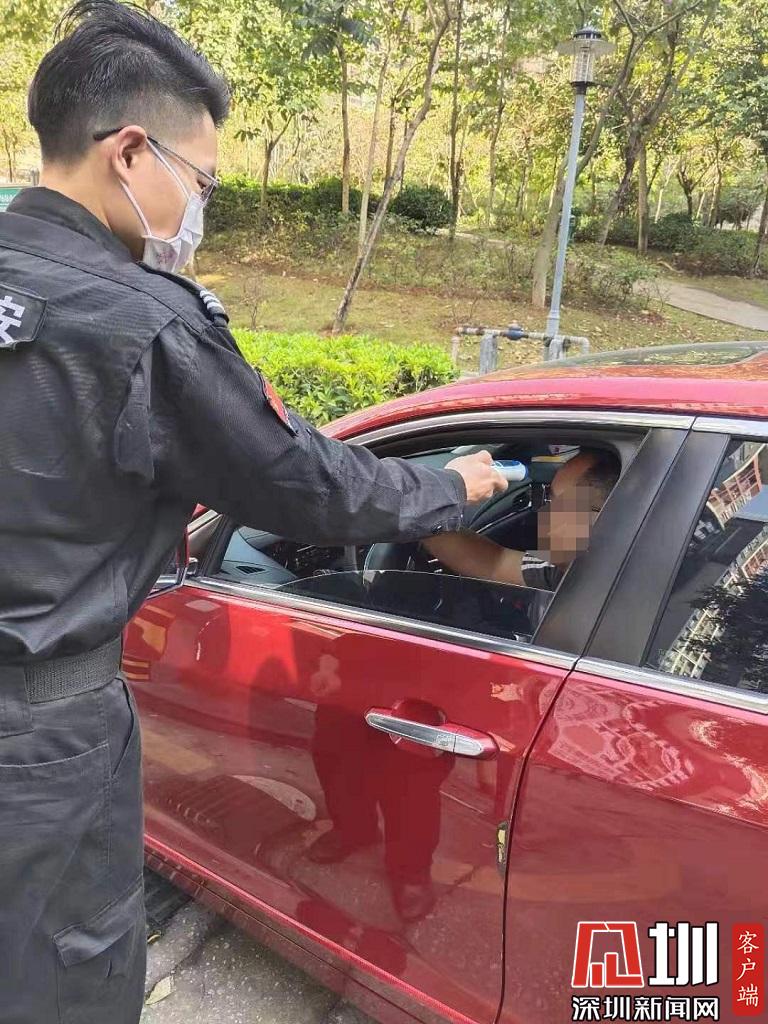保安對(duì)進(jìn)出小區(qū)車主進(jìn)行體溫測(cè)量。