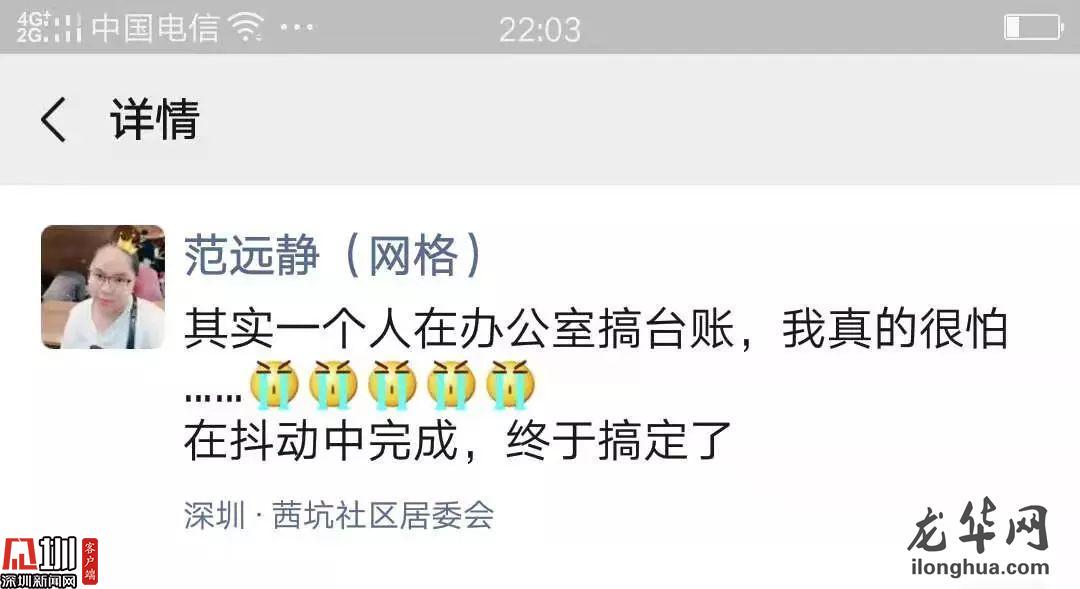 龍華區(qū)福城街道茜坑社區(qū)網(wǎng)格站資料員范遠(yuǎn)靜被凍得瑟瑟發(fā)抖,但停不下手里的活,不斷地整理、更新手中的湖北籍,特別是武漢籍社區(qū)人員離、返深信息,每天將前線網(wǎng)格員們辛苦采集到信息制作成臺賬,以保證在第二天早上六點(diǎn)前能上報(bào)給街道,用心做好社區(qū)疫情防控幕后工作,保障社區(qū)居民安全。