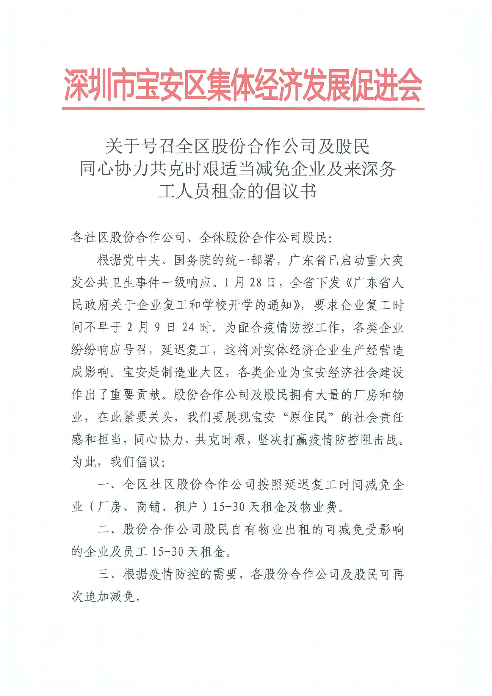倡議書中寫道,為配合疫情防控工作,各類企業(yè)紛紛響應號召,延遲復工,這將對實體經(jīng)濟企業(yè)生產(chǎn)經(jīng)營造成影響。寶安是制造業(yè)大區(qū),各類企業(yè)為寶安經(jīng)濟社會建設作出了重要貢獻。股份合作公司及股民擁有大量的廠房和物業(yè),在此緊要關頭,我們要展現(xiàn)寶安“原住民”的社會責任感和擔當,同心協(xié)力,共克時艱,堅決打贏疫情防控阻擊戰(zhàn)。為此,寶安區(qū)集體資產(chǎn)管理局指導寶安區(qū)集體經(jīng)濟發(fā)展促進會發(fā)起倡議,號召全區(qū)股份合作公司及股民按照延遲復工時間減免企業(yè)(廠房、商鋪、租戶)15-30天租金及物業(yè)費;股份合作公司股民自有物業(yè)出租的可減免受影響的企業(yè)及員工15-30天租金;同時,根據(jù)疫情防控的需要,各股份合作公司及股民可再次追加減免。
