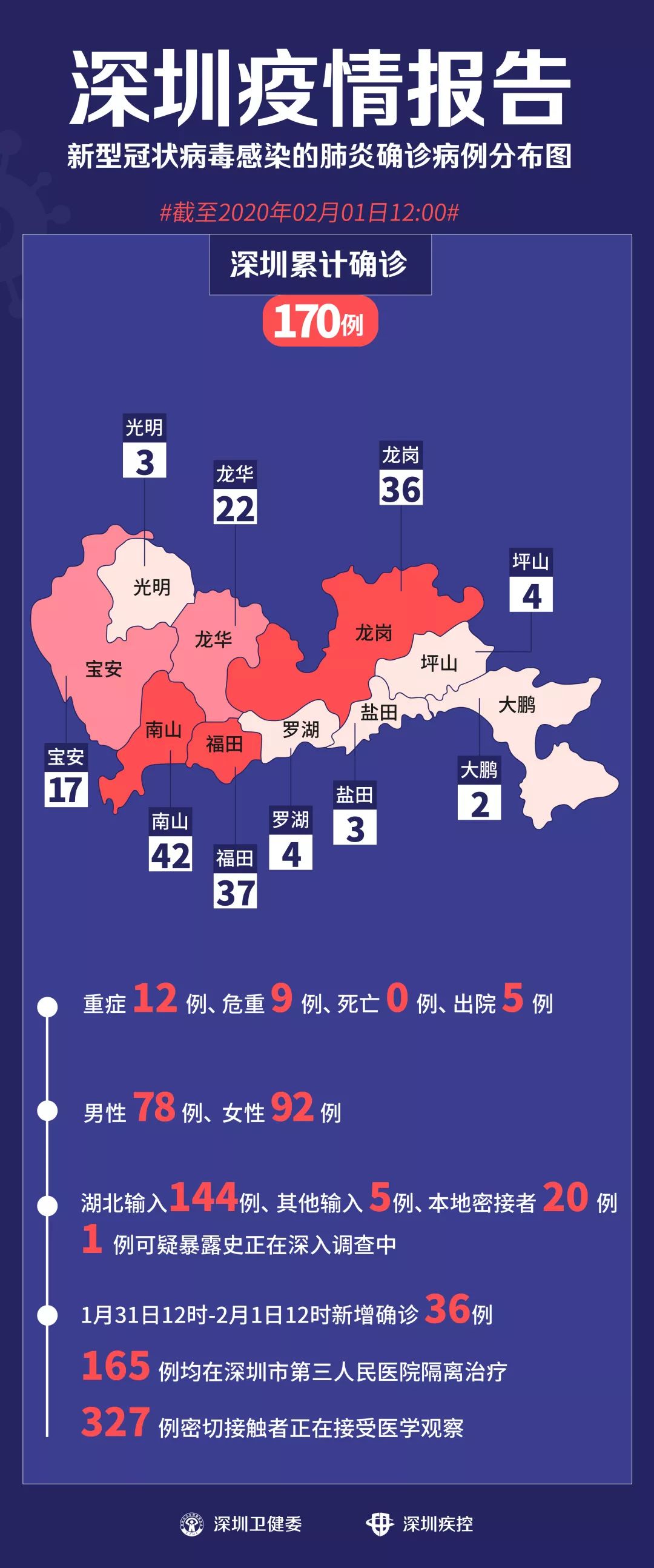 深圳病人糞便中檢出病毒陽性 2月1日晚,深圳市第三人民醫(yī)院透露,該院肝病研究所發(fā)現(xiàn),在某些新型冠狀病毒感染的肺炎確診患者的糞便中檢測出2019-nCoV核酸(新型冠狀病毒)陽性,很有可能提示糞便中有活病毒存在。目前研究人員正在做進(jìn)一步分離病毒的研究。 此外,國際醫(yī)學(xué)期刊《新英格蘭醫(yī)學(xué)雜志》最新刊登的一篇文章也透露,醫(yī)生們在美國首位“新型肺炎”病人的腹瀉糞便樣本中檢測出了新型冠狀病毒的存在(rRT-PCR結(jié)果陽性)。 在此提醒市民,一定要更加注意勤洗手,尤其是便后、飯前,一定要用流水+肥皂或洗手液,洗手20秒以上。 1月31日12時(shí)至2月1日12時(shí),深圳新增36個(gè)確診病例 病例135 47歲女性患者,常住北京。1月15日前往武漢探親,22日乘私家車前往深圳。1月23日發(fā)病,1月27日入院,目前情況穩(wěn)定。 病例136 病例98的女兒 4歲女性患者,常住湖北省十堰市。在密切接觸者采樣檢測中,發(fā)現(xiàn)新型冠狀病毒陽性,故于1月27日入院,目前情況穩(wěn)定。 病例97:64歲男性患者,常住于湖北省十堰市。2020年1月22日抵達(dá)深圳,24日發(fā)病,26日入院就診。 病例98(病例97的兒子):40歲男性患者,常住于深圳市龍崗區(qū)。2020年1月22日,父親從湖北抵達(dá)深圳,24日發(fā)病,26日入院就診。 病例137 56歲男性患者,常住湖北省武漢市。1月21號前往深圳。1月26日發(fā)病,1月28日入院,目前情況穩(wěn)定。 病例138 59歲男性患者,常住深圳市龍華區(qū)。1月16日自駕從深圳前往武漢,1月23日開車回到深圳。1月26日發(fā)病,當(dāng)日入院,目前情況穩(wěn)定。 病例139 病例138妻子 57歲女性患者,常住深圳市龍華區(qū)。1月16日自駕深圳前往武漢,1月23日開車回到深圳。1月24日發(fā)病,1月26日入院,目前情況穩(wěn)定。 病例140 66歲女性患者,常住湖北省武漢市。1月22日前往深圳。1月23日發(fā)病,1月28日入院,目前情況穩(wěn)定。 病例141 78歲男性患者,常住湖北省武漢市。1月16日前往深圳探親。1月26日發(fā)病,1月27日入院,目前情況穩(wěn)定。 病例142 61歲女性患者,常住湖北省武漢市。1月21日前往深圳探親。1月22日發(fā)病,1月28日入院,目前情況穩(wěn)定。 病例143 54歲男性患者,常住深圳市南山區(qū)。1月21日前往武漢,23日返回深圳。1月25日發(fā)病,1月28日入院,目前情況穩(wěn)定。 病例144 55歲女性患者,常住深圳市南山區(qū)。1月21日由深圳前往武漢,23日返回深圳。1月24日發(fā)病,1月29日入院,目前情況穩(wěn)定。 病例145 57歲女性患者,常住深圳市南山區(qū)。1月13日從深圳到武漢探親,1月23日從武漢自駕返回深圳。1月26日發(fā)病,1月27日入院,目前情況穩(wěn)定。 病例146 病例29父親 76歲男性患者,常住湖北省武漢市。1月15日從武漢出發(fā)前往廣西南寧旅游,1月18日從廣西南寧出發(fā)前往深圳探親。1月27日發(fā)病,1月28日入院,目前情況穩(wěn)定。 病例29:49歲女性患者,長期居住湖北武漢,2020年1月15日從武漢到廣西南寧,18日從南寧到佛山,20日從佛山抵達(dá)深圳,21日發(fā)病,22日入院就診。 病例147 病例105的女兒 6歲女性患者,常住深圳市羅湖區(qū)。1月12日前往武漢,1月22日乘私家車前往河南信陽,23日乘私家車前往深圳。在密切接觸者采樣檢測中發(fā)現(xiàn),新型冠狀病毒陽性,故于1月28日入院,目前情況穩(wěn)定。 病例105:35歲男性患者,常住于深圳市羅湖區(qū)。2020年1月17日自駕車由深圳開往武漢,22日自駕車從武漢開往河南信陽探親,23日自駕車從河南信陽開往深圳,當(dāng)日發(fā)病,25日入院就診。 病例106(病例105妻子):36歲女性患者,常住于深圳市羅湖區(qū)。2020年1月17日乘私家車由深圳到武漢,22日乘私家車從武漢到河南信陽探親,23日乘私家車從河南信陽到深圳,24日發(fā)病,25日入院就診。 病例107(病例105丈母娘):61歲女性患者,常住于深圳市羅湖區(qū)。1月12日從深圳前往武漢,22日乘私家車從武漢到河南信陽探親,23日乘私家車從河南信陽到深圳,24日發(fā)病,25日入院就診。 病例148 38歲女性患者,常住深圳市福田區(qū)。1月23日接觸從武漢來深的父母(都未確診)。1月27日發(fā)病,當(dāng)日入院,目前情況穩(wěn)定。 病例149 33歲女性患者,常住深圳市福田區(qū)。1月19日前往武漢,乘私家車到潛江探親,1月24日乘私家車返回深圳。1月28日發(fā)病,當(dāng)日入院,目前情況穩(wěn)定。 病例150 49歲男性患者,常住深圳市龍華區(qū)。1月18日前往武漢探親,1月23日回到深圳。1月25日發(fā)病,1月27日入院,目前情況穩(wěn)定。 病例151 病例150的女兒 18歲女性患者,常住深圳市龍華區(qū)。1月18日前往武漢探親,1月23日回到深圳。1月25日發(fā)病,1月29日入院,目前情況穩(wěn)定。 病例152 56歲女性患者,常住江蘇省南京市。1月21日乘私家車到武漢,1月22日前往深圳。1月26日發(fā)病,當(dāng)日入院,目前情況穩(wěn)定。 病例153 病例84的丈夫 58歲男性患者,常住深圳市龍華區(qū)。在密切接觸者采樣檢測中發(fā)現(xiàn),新型冠狀病毒陽性,故于1月29日入院,目前情況穩(wěn)定。 病例84:52歲女性患者,常住深圳市龍華區(qū)。2020年1月19日至22日在武漢,22日-23日從武漢到仙桃市探親,23日發(fā)病,24日駕車至長沙,25日從長沙抵達(dá)深圳后入院就診。 病例154 病例114的妻子 34歲女性患者,常住深圳市龍華區(qū)。1月22日前往湖南省冷水江市,1