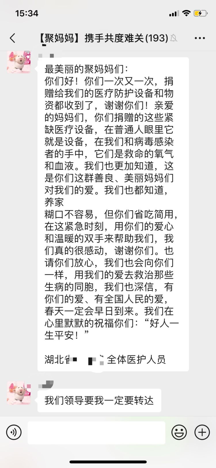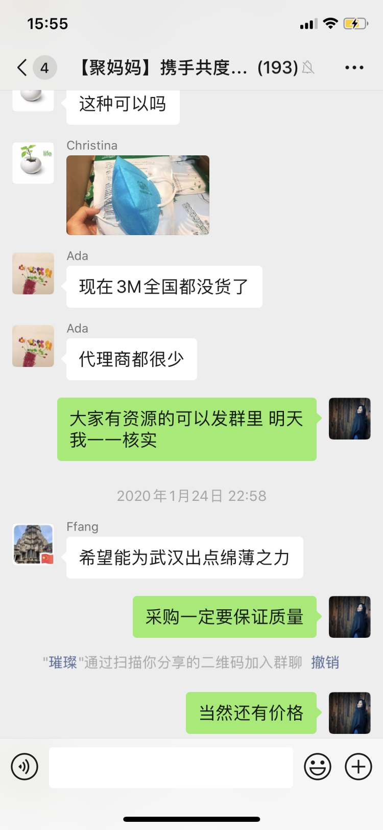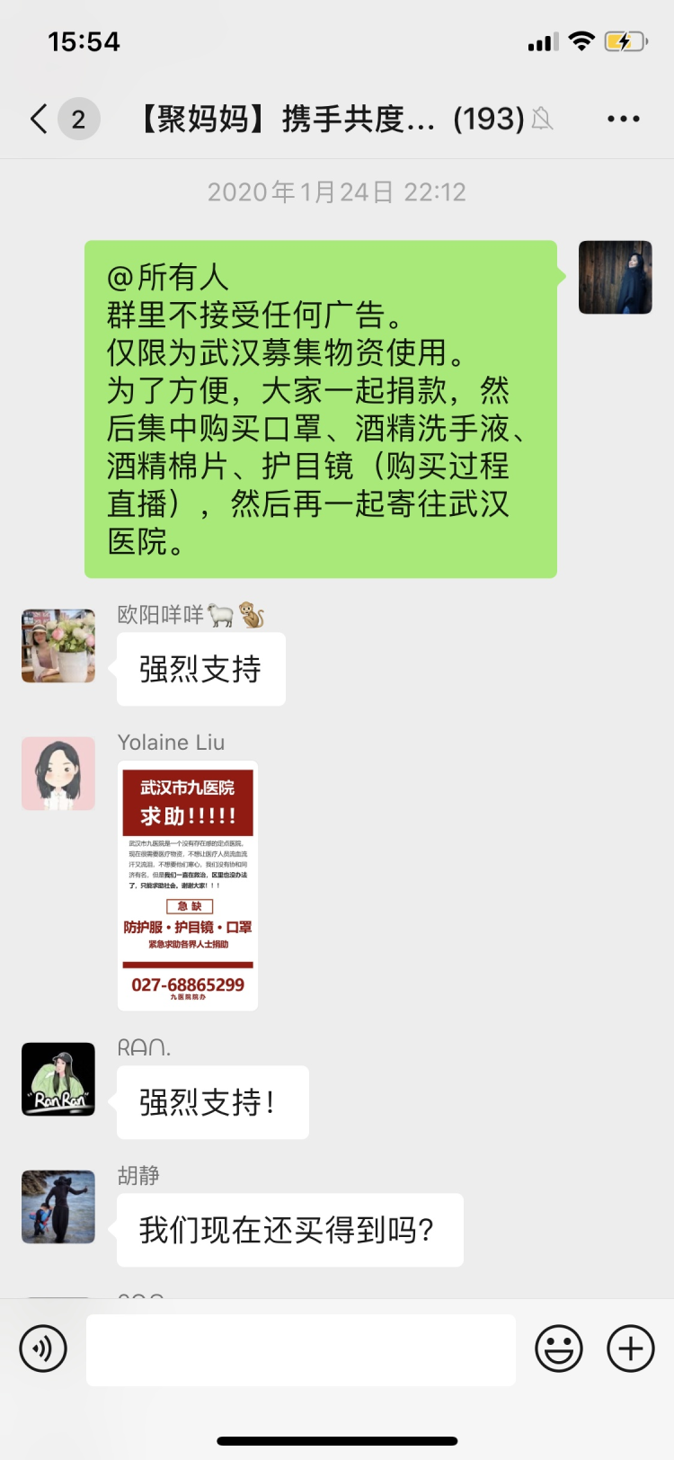這一百多名媽媽是一個(gè)名為“聚媽媽攜手共渡難關(guān)”(以下簡(jiǎn)稱“聚媽媽”)微信群的成員,Miya是“聚媽媽”的發(fā)起人之一。1月24日除夕那天,Miya與一位朋友聊起疫情,兩人都覺得,醫(yī)院缺物資,一兩人的力量又太單薄,不如發(fā)動(dòng)朋友們一起購(gòu)買直接送到醫(yī)院。Miya在當(dāng)晚9點(diǎn)左右建了這個(gè)臨時(shí)群,并邀請(qǐng)周圍熟識(shí)的朋友加入。