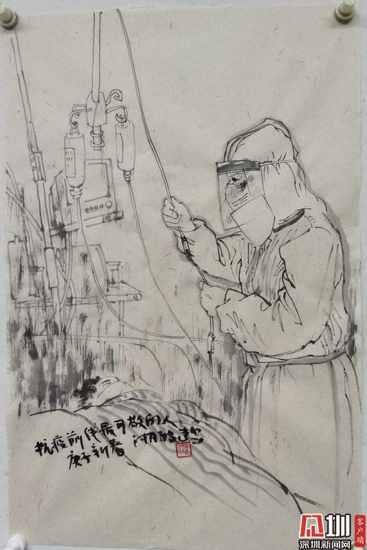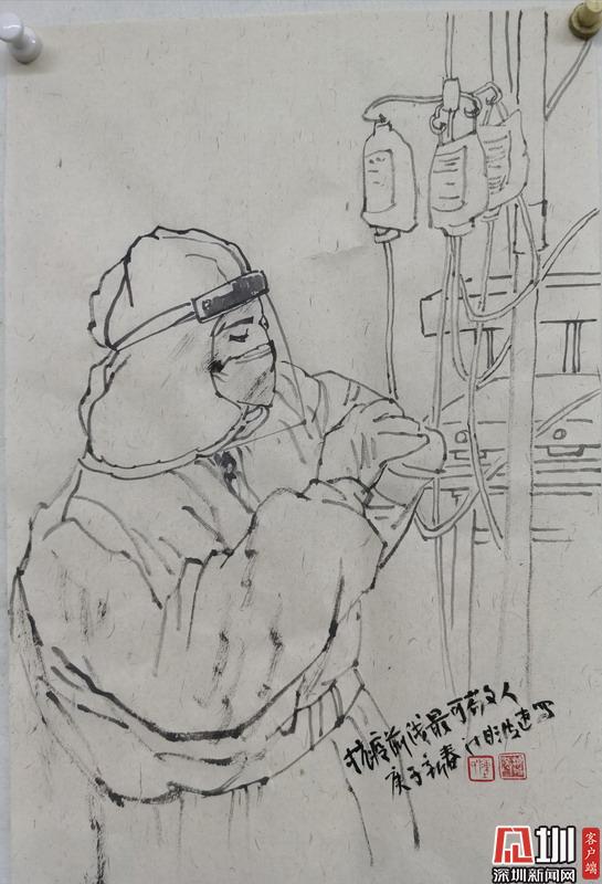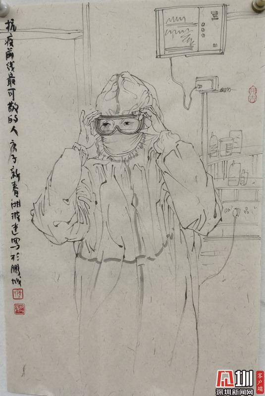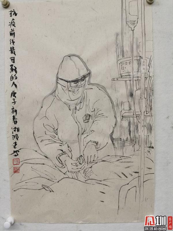 為向這些逆行者致敬,近日,廣東省美術(shù)家協(xié)會副主席、深圳市美協(xié)主席、深圳市關(guān)山月美術(shù)館館長陳湘波創(chuàng)作了一批精彩的白描速寫和書法作品,希望能以此鼓舞人心,提振廣大市民戰(zhàn)勝疫情的信心。